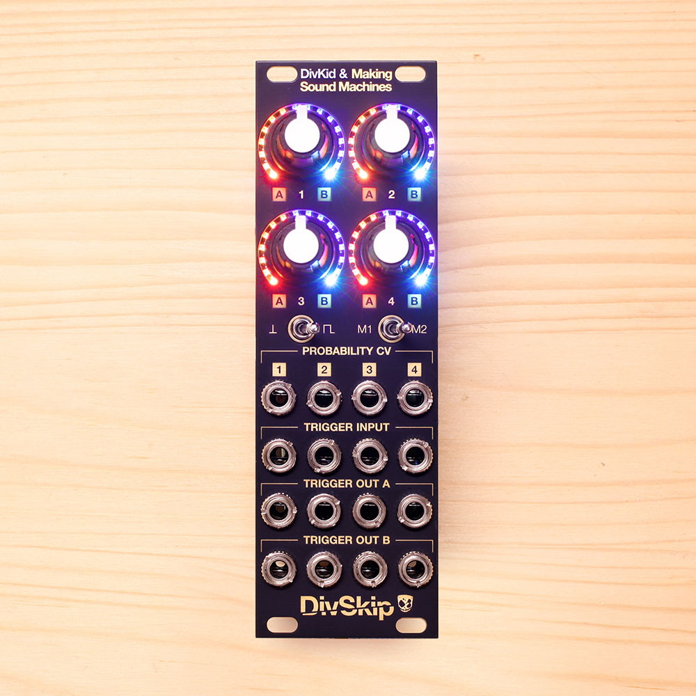 DivSkip is a four channel Trigger processor for Eurorack. Eight modes on four independent channels make this 8HP module a Swiss Army Knife to chain behind clock utilities, trigger sequencers and logic modules.